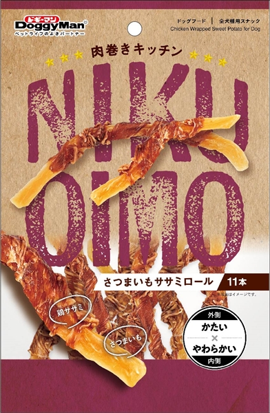ハードな食感に仕上げた鶏ササミを、ソフトなさつまいもに巻きつけたハード&ソフトタイプ。