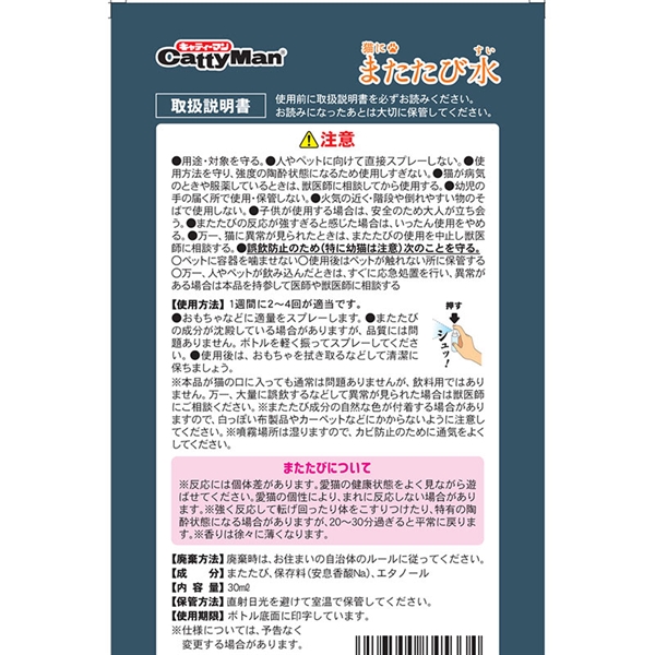 ※またたび成分の自然な色が付着する場合がありますので、白っぽい布製品やカーペットなどにかからないように注意してください。
