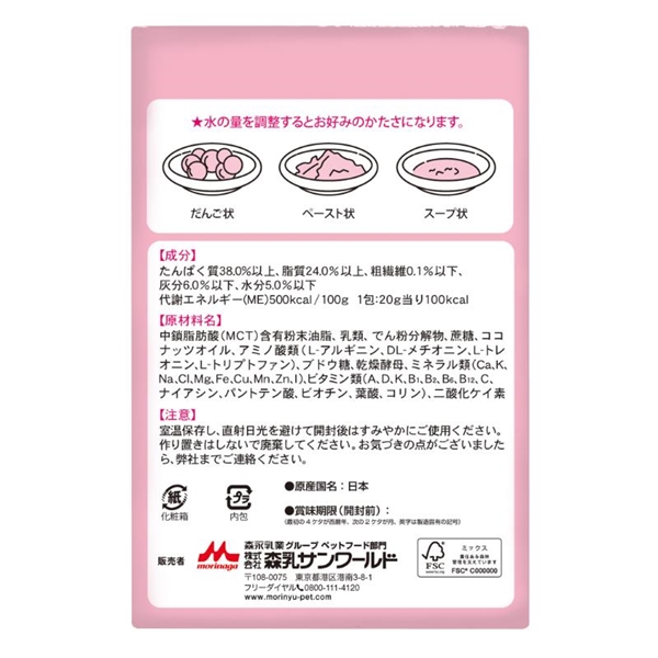 中鎖脂肪酸(MCT)含有粉末油脂、乳類、でん粉分解物、蔗糖、ココナッツオイル、アミノ酸類(L-アルギニン、DL-メチオニン、L-トレオニン、L-トリプトファン)、ブドウ糖、乾燥酵母、ミネラル類(Ca、K、Na、Cl、Mg、Fe、Cu、Mn、Zn、I)、ビタミン類(A、D、K、B1、B2、B6、B12、C、ナイアシン、パントテン酸、ビオチン、葉酸、コリン)、二酸化ケイ素