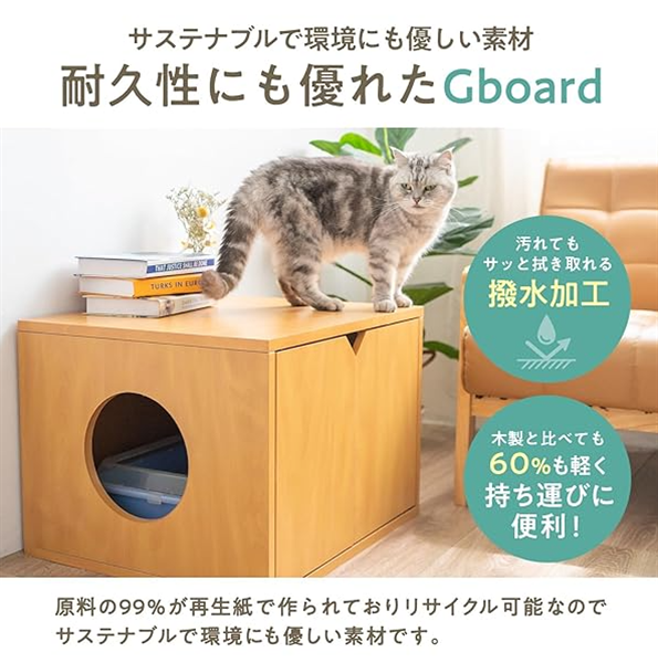 耐久性と軽さを兼ね備えた紙パネル「GBoard」を使用し、原料の99%が再生紙の猫用トイレカバー。