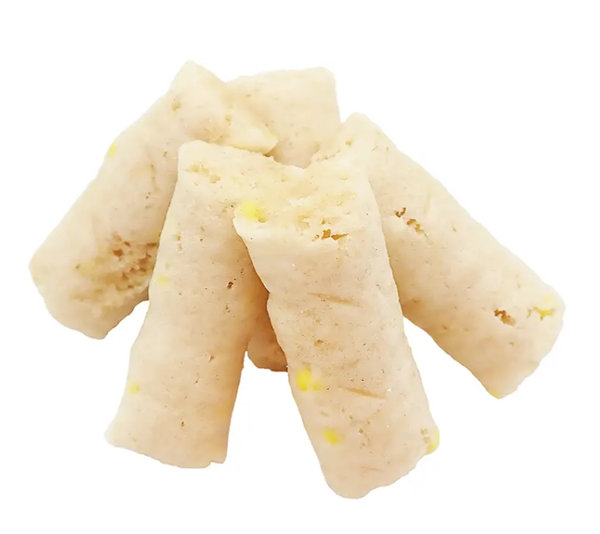 小麦粉、コーンスターチ、鶏胸肉、魚肉(白身魚、軟骨)、ナチュラルチーズ、さつまいも、ソルビトール、グリセリン、膨張剤、プロピレングリコール、炭酸カルシウム、食塩、リン酸塩(Na)、セルロース、着色料(黄4)、調味料