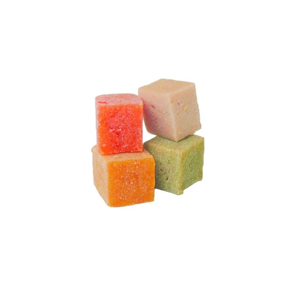 小麦粉、鶏ささみ、鶏肉、脱脂大豆、糖類、じゃがいもでん粉、小麦グルテン、バターミルクパウダー、牛脂、野菜類(かぼちゃ、にんじん、キャベツ、ほうれん草)、ビーフパウダー、フィッシュパウダー、プロピレングリコール、ソルビトール、ミネラル・ビタミン類、リン酸塩(Na)、保存料(ソルビン酸K、デヒドロ酢酸Na)、食塩、酸化防止剤(エリソルビン酸Na)、着色料(酸化チタン、黄4、黄5、赤2、赤102、赤106、青1)