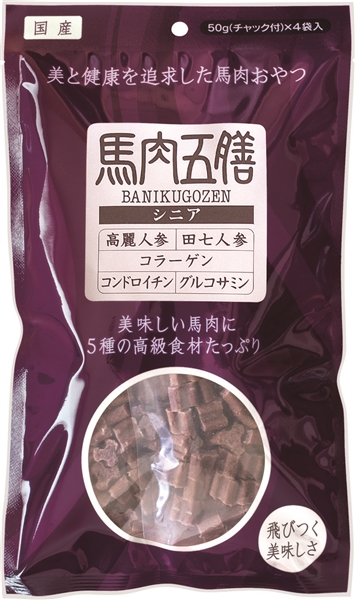 馬肉、乾燥マッシュポテト、ソルビトール、澱粉分解物、澱粉、グリセリン、カゼインナトリウム、高麗人参、田七人参、霊芝、コラーゲンペプチド、ローヤルゼリー、コンドロイチン、グルコサミン、かき殻、ハトムギ、鹿の角、まむし、魚骨、ローズマリー抽出物、保存料(ソルビン酸カリウム)、リン酸ナトリウム、酸化防止剤(ビタミンC,ビタミンE)粗たんぱく質26.2%以上、粗脂肪7.8%以上、粗繊維0.3%以下、粗灰分2.5%以下、水20.0%以下 313kcal/100g