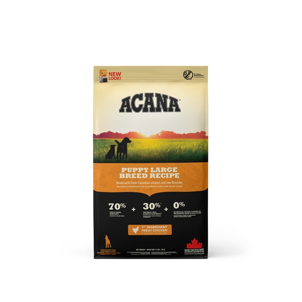 カナダ産の新鮮な鶏肉や生のヘイクなどの高品質な動物原材料を70%、フルーツや野菜、ハーブを30%とバランスよく配合したこのドッグフードは、脂肪分を抑えて急激な体重増加を防ぐため、成長期の大型犬・超大型犬の子犬の健康をサポートします。