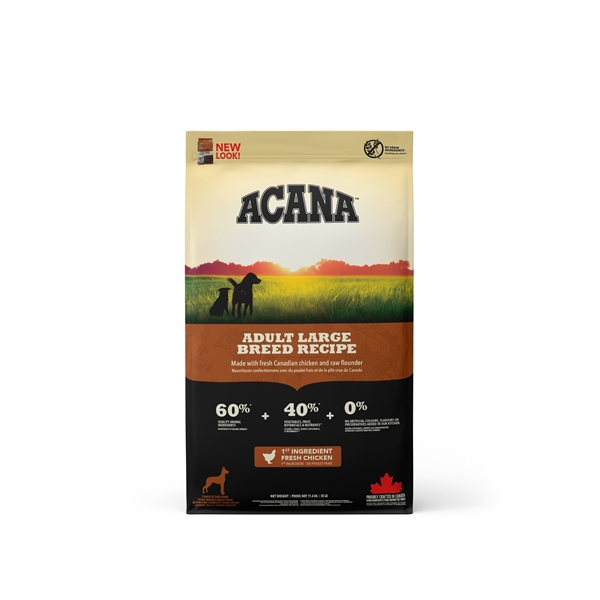 カナダ産の新鮮な鶏肉や生のヘイクなどの高品質な動物原材料を60%、フルーツや野菜、ハーブを40%とバランスよく配合し、大型犬に多い太りすぎによる関節障害に配慮し、脂肪と炭水化物を控えめに調整。