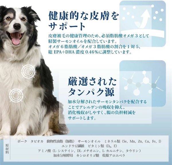 加水分解サーモンタンパクを使用し、腸内アレルゲン負荷を制御、同時に消化しやすく調整されています。