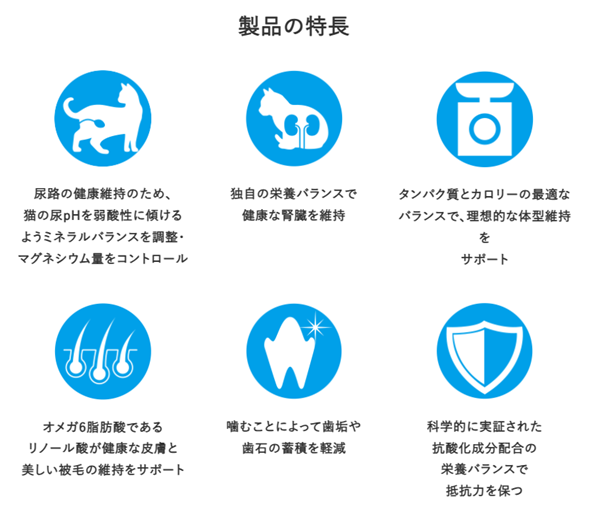 チキン、米、コーングルテン、小麦、鶏脂(オメガ6脂肪酸源)、魚油(オメガ3脂肪酸源)、乾燥ツナ、乳酸菌、たんぱく加水分解物、ミネラル類(カルシウム、リン、カリウム、ナトリウム、クロライド、マグネシウム、鉄、銅、マンガン、亜鉛、ヨウ素、セレン)、ビタミン類(A、D、E、B1、B2、パントテン酸、ナイアシン、B6、葉酸、B12、コリン、C、ベータカロテン)、アミノ酸類(アルギニン、タウリン)、ピロリン酸Na、酸化防止剤(ミックストコフェロール)