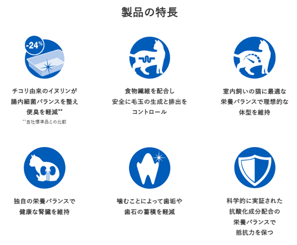 チキン、米、小麦、コーングルテン、食物繊維(セルロース、チコリ、ビートパルプ、ライスファイバー)、鶏脂(オメガ6脂肪酸源)、乾燥ツナ、魚油(オメガ3脂肪酸源)、乳酸菌、たんぱく加水分解物、ミネラル類(カルシウム、リン、カリウム、ナトリウム、クロライド、マグネシウム、鉄、銅、マンガン、亜鉛、ヨウ素、セレン)、ビタミン類(A、D、E、B1、B2、パントテン酸、ナイアシン、B6、葉酸、B12、コリン、C、ベータカロテン)、アミノ酸類(アルギニン、タウリン)、ピロリン酸Na、酸化防止剤(ミックストコフェロール)
