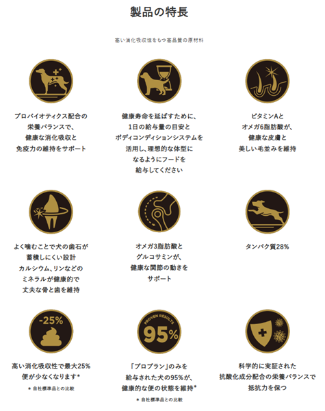 乾燥チキン、チキン、米、小麦、オーツ麦、大麦、鶏脂肪(オメガ6脂肪酸源)、小麦タンパク、タンパク加水分解物、ビートパルプ、魚油(オ メガ3脂肪酸源)、乳酸菌(プロバイオティクス)、ミネラル類(カルシウム、リン、カリウム、ナトリウム、クロライド、マグネシウム、鉄、 銅、マンガン、亜鉛、ヨウ素、セレン、ゼオライト)、ビタミン類(A、D、E、B1、B 2、パントテン酸、ナイアシン、B6、葉酸、B12、コリン、C)、アミノ酸類(メチオニン、グルコサミン)、酸化防止剤(ミックストコフェロー ル)